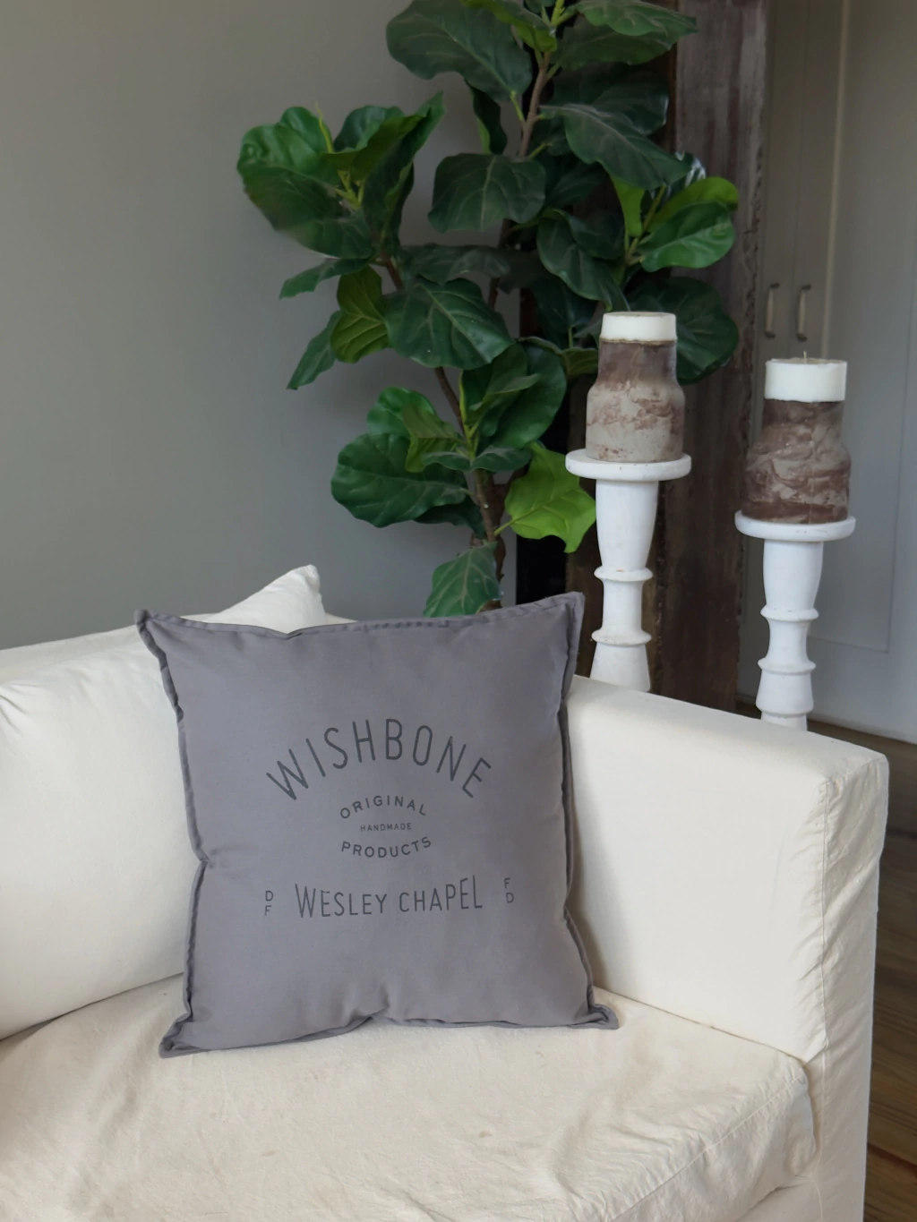 El almohadón Chapel está confeccionado en canvas, con una estética gráfica de inspiración vintage estampado artesanalmente.