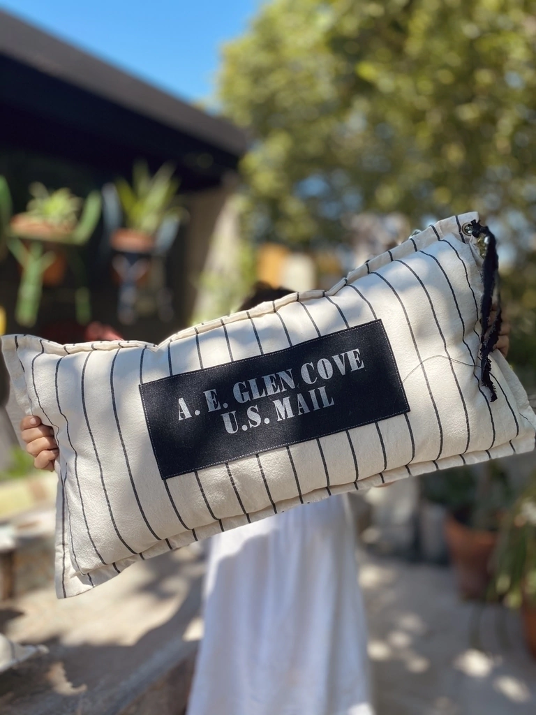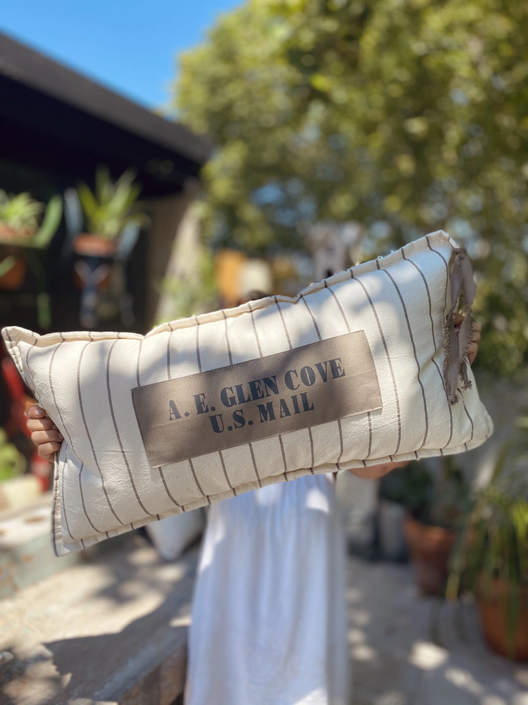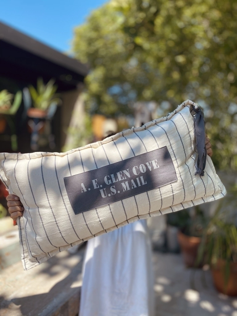 Almohadón/funda realizada en tusor rayado, en el centro una estampa en referencia a un lugar donde viví, un pequeño pueblo llamado "Glen Cove".