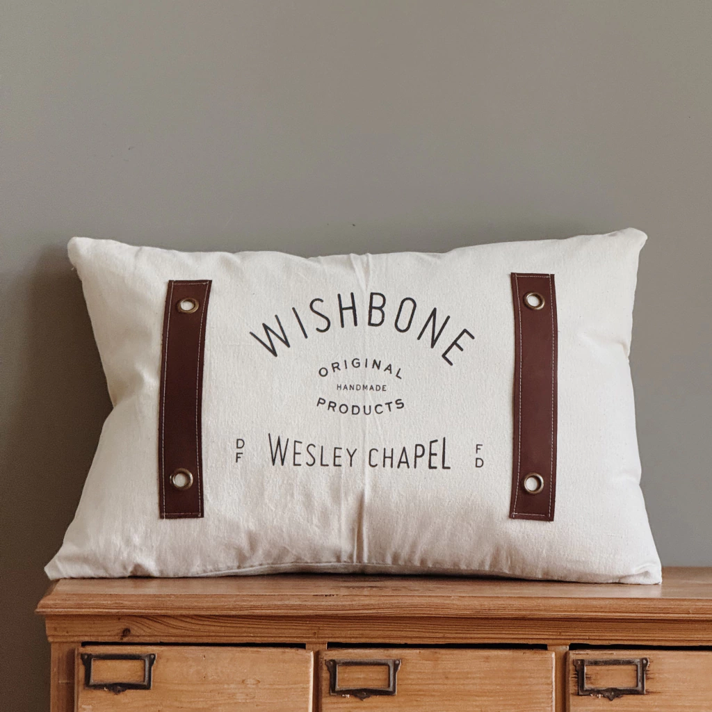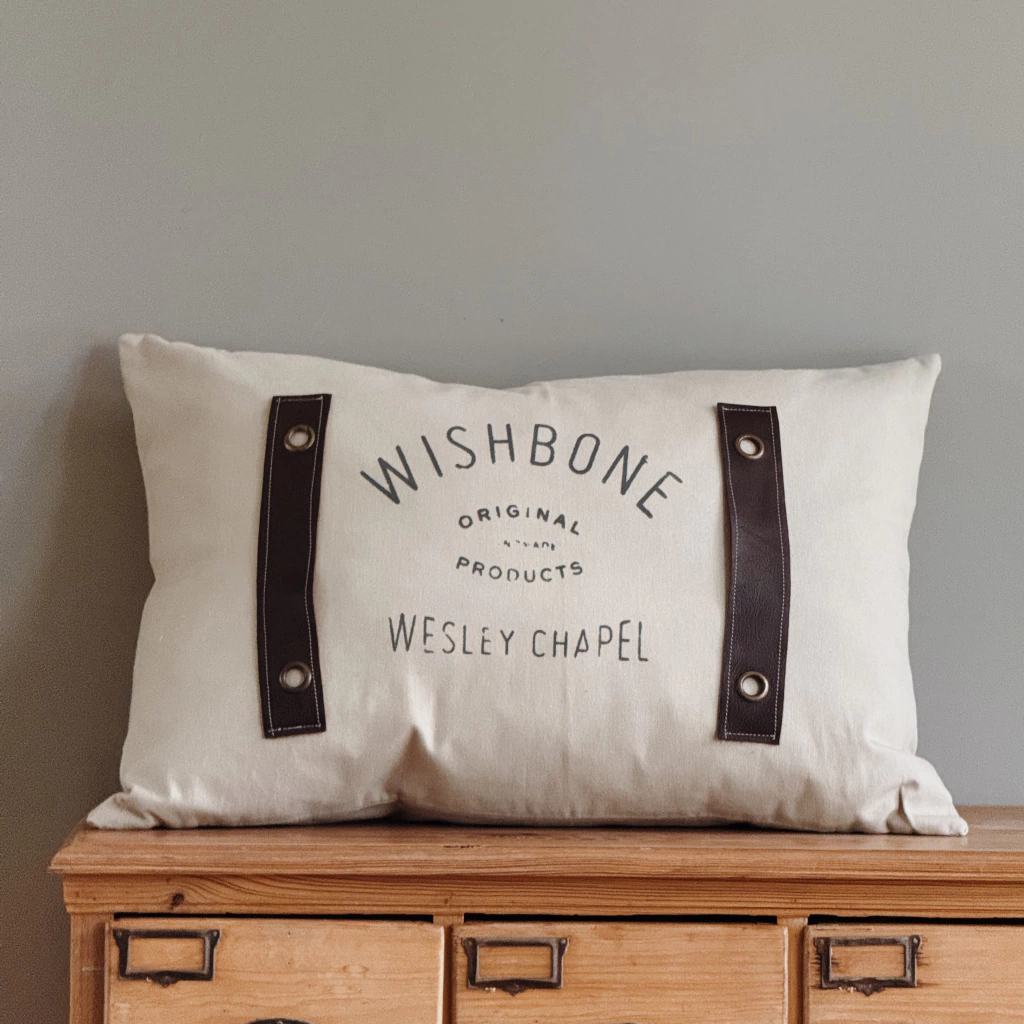 El almohadón Wesley está confeccionado en canvas, con detalles en cuero y bronce antiguo que le suman textura y carácter. La estampa central está realizada artesanalmente, con una estética gráfica de inspiración vintage.