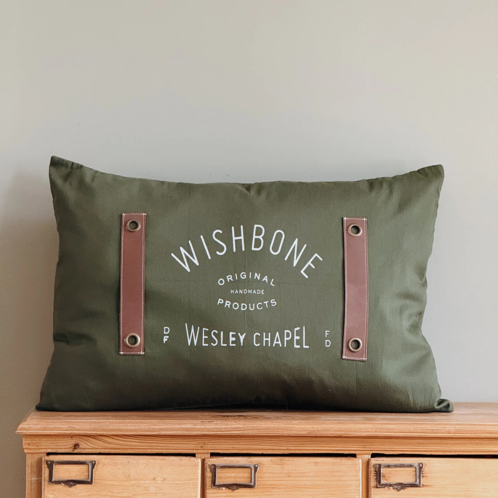 El almohadón Wesley está confeccionado en canvas, con detalles en cuero y bronce antiguo que le suman textura y carácter. La estampa central está realizada artesanalmente, con una estética gráfica de inspiración vintage.