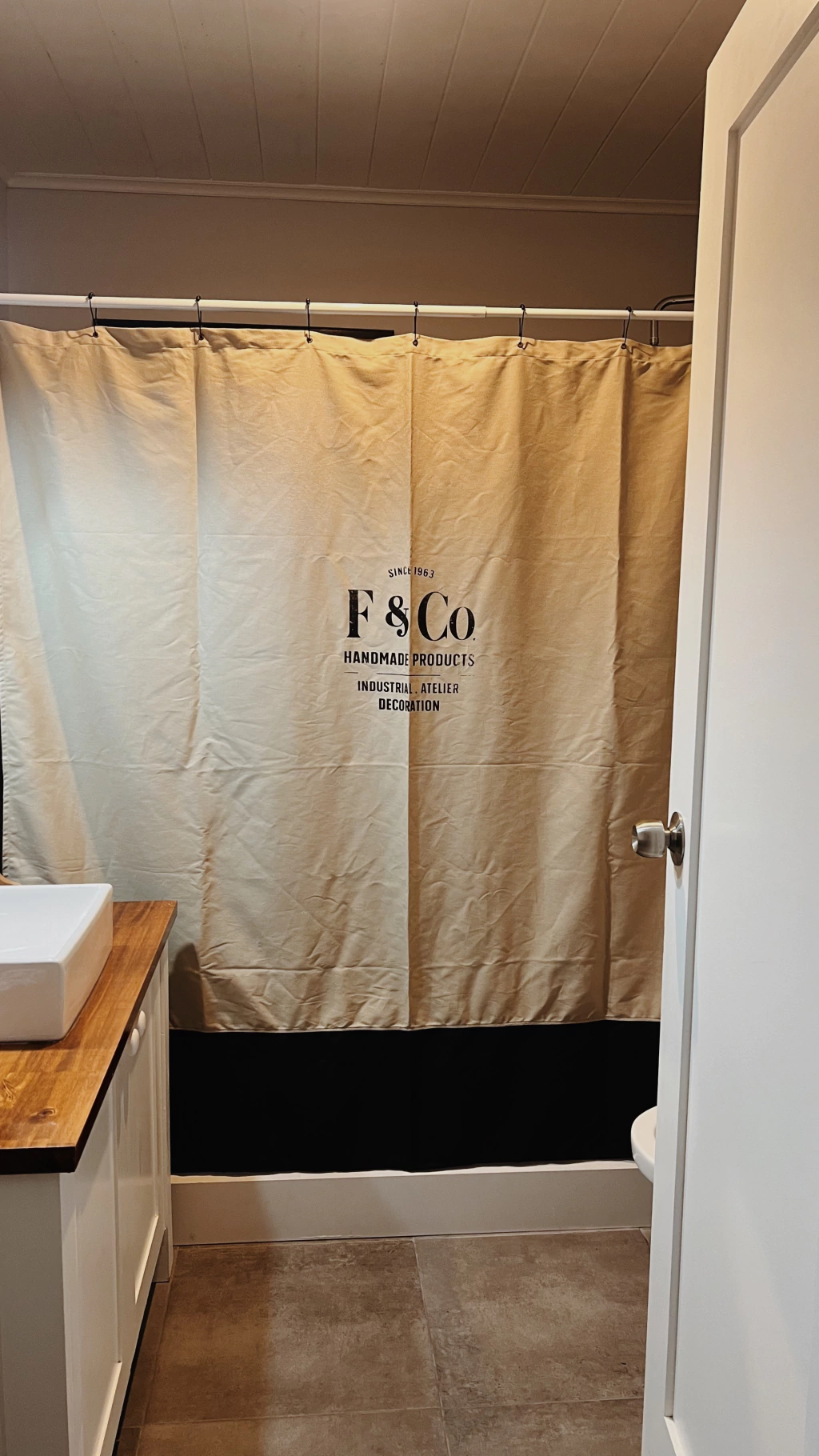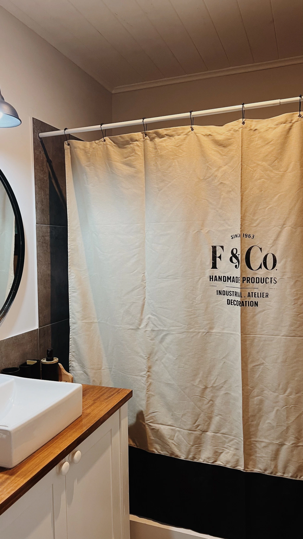 Cortina de baño en tela Canva con estampa de diseño propio.