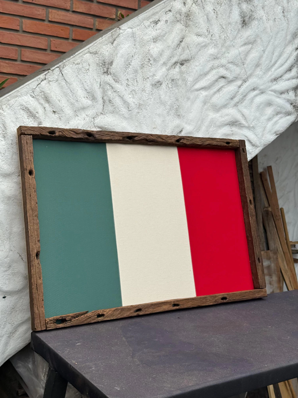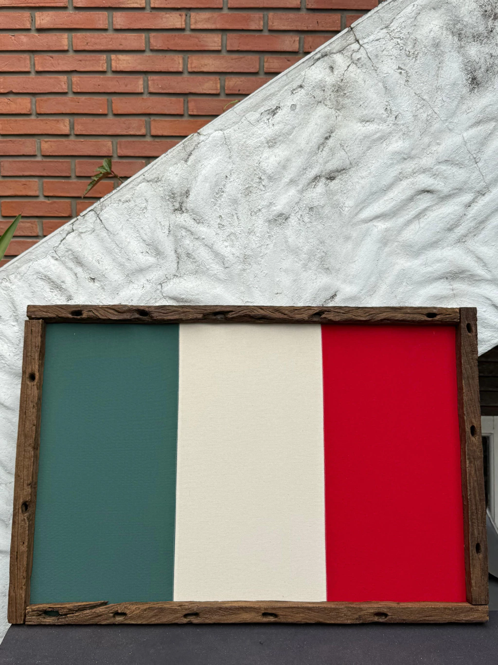 Cuadros rústicos inspirados en banderas de distintos paises, en ellos buscamos crear un efecto de banderas de ayuntamiento antiguas, combinando estampas, distintas telas y varillas de madera antiguas.