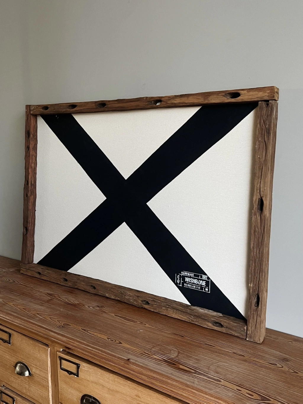 Nuestra Cruz Wishbone está cosida y estampada a mano, cuidando cada detalle. El marco está hecho con auténticas varillas de campo restauradas, conservando sus marcas del tiempo y su historia.