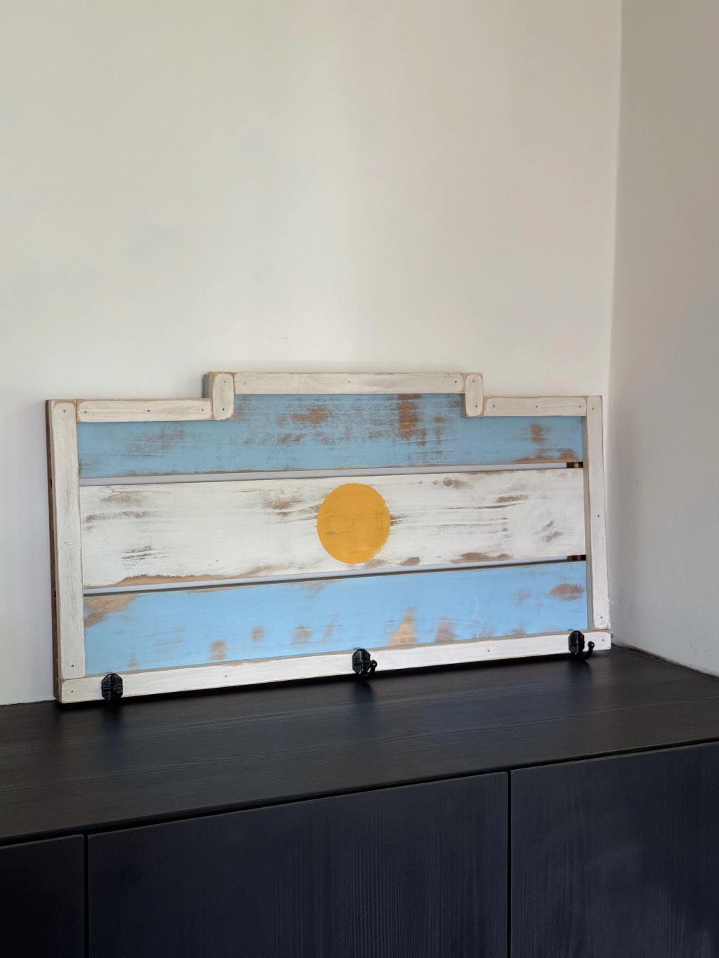 Cuadro de madera perchero, pintado a mano simulando la bandera de Argentina. Hermoso para decorar con un toque distintivo.