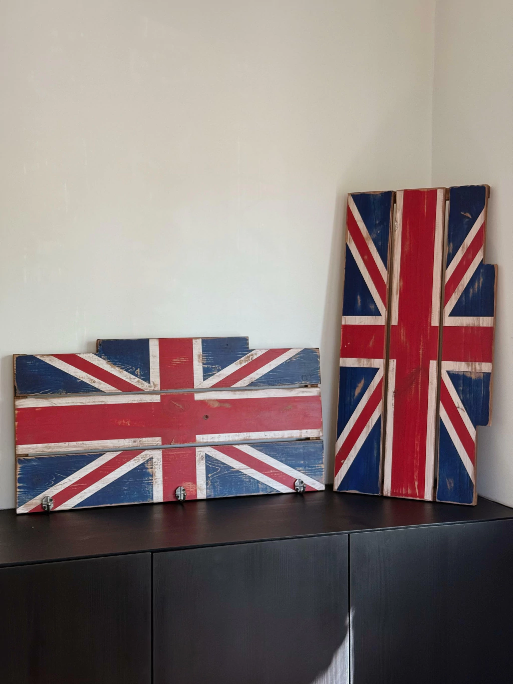 Cuadro de madera perchero, pintado a mano simulando la bandera de UK. Hermoso para decorar con un toque distintivo.