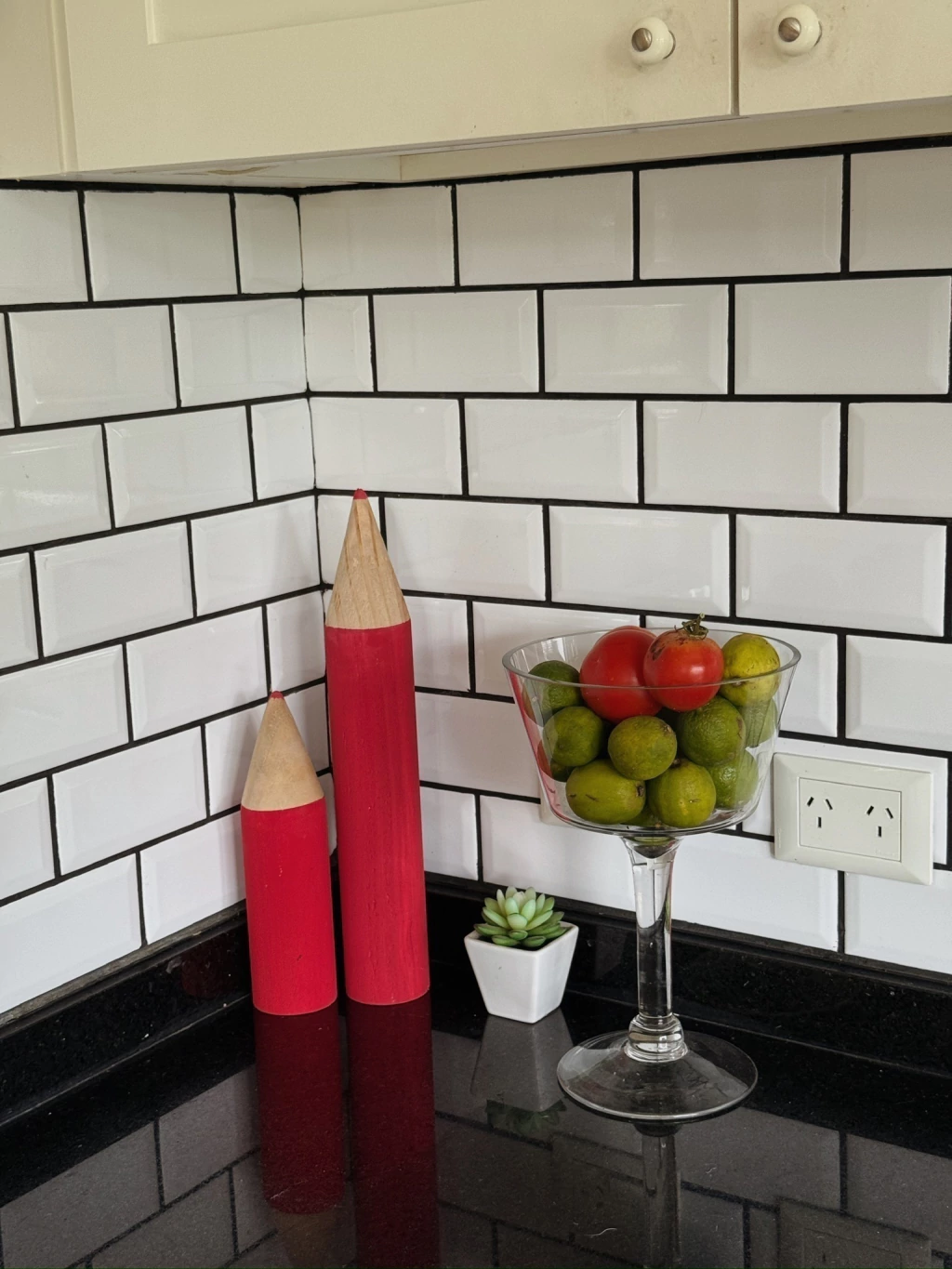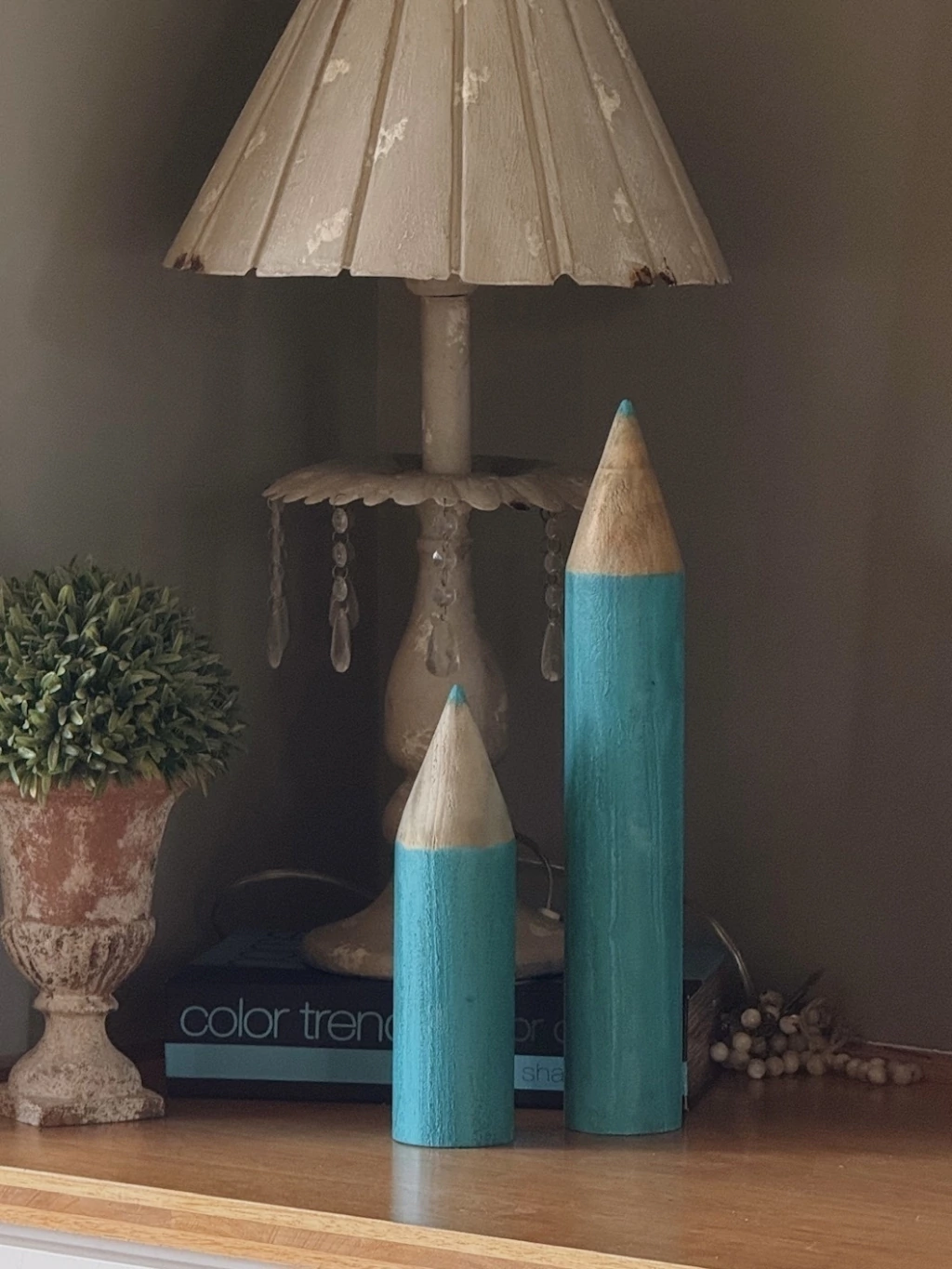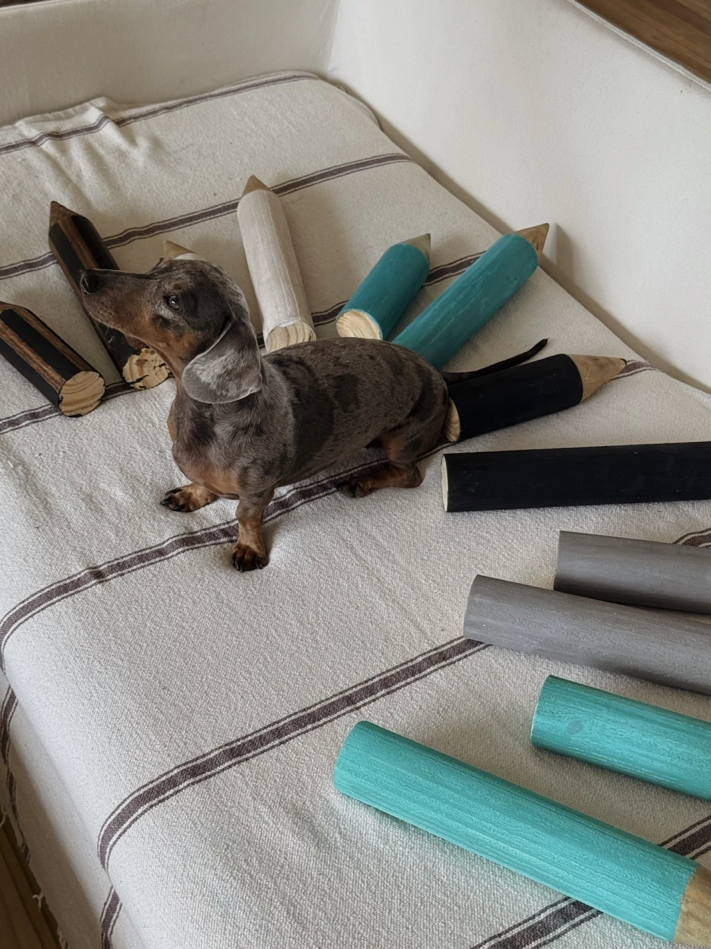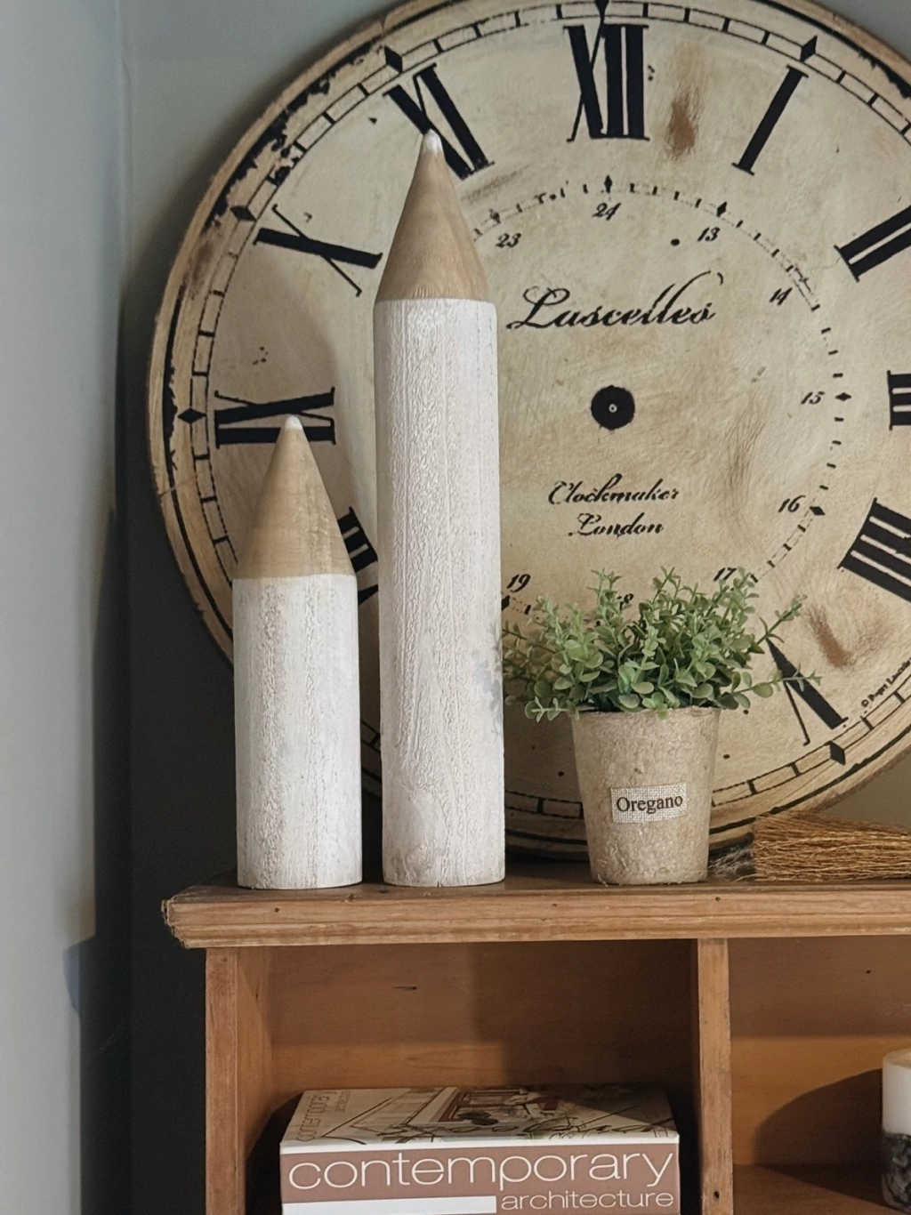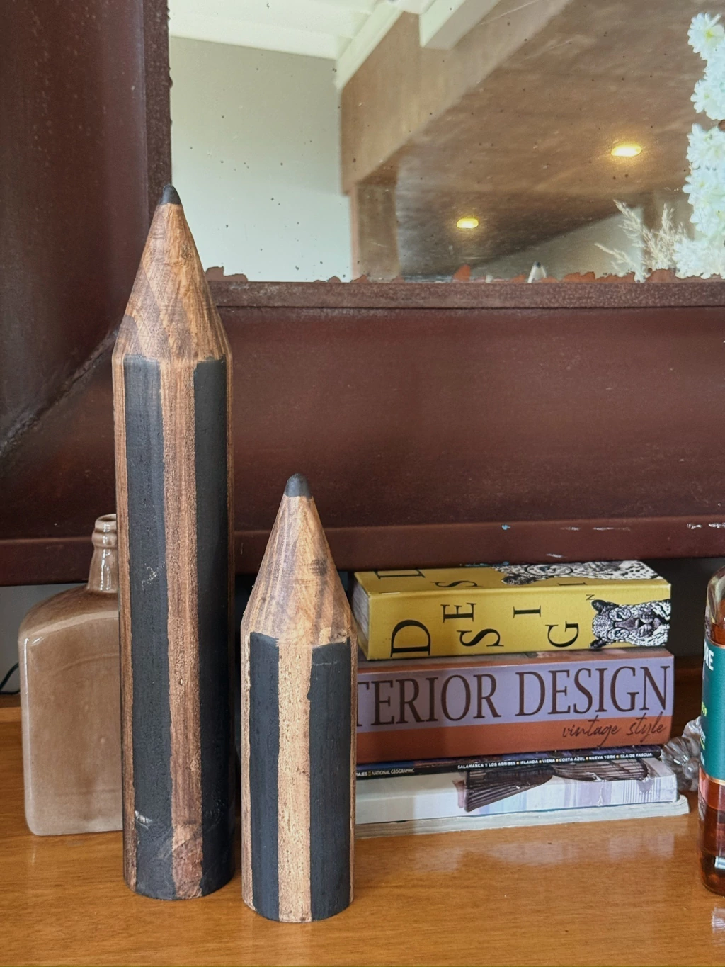 Torneados y pintados a mano, estos lápices de madera son un objeto único y lleno de carácter. Su diseño simple y lúdico los convierte en un acento ideal para bibliotecas, escritorios o rincones creativos.