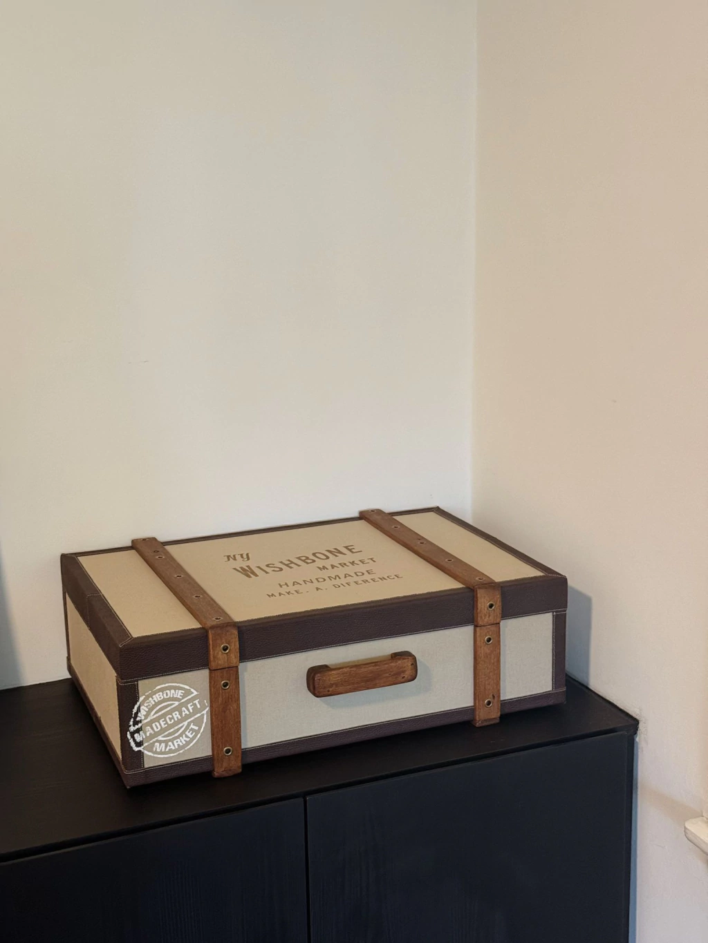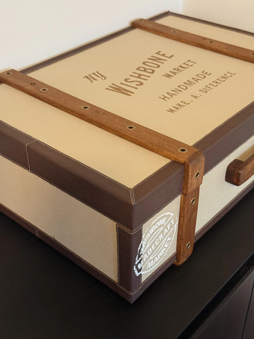 Nuestra falsa valija está hecha a mano, con telas seleccionadas, manijas de madera y terminaciones en cuero y muchos detalles más que te van a encantar.